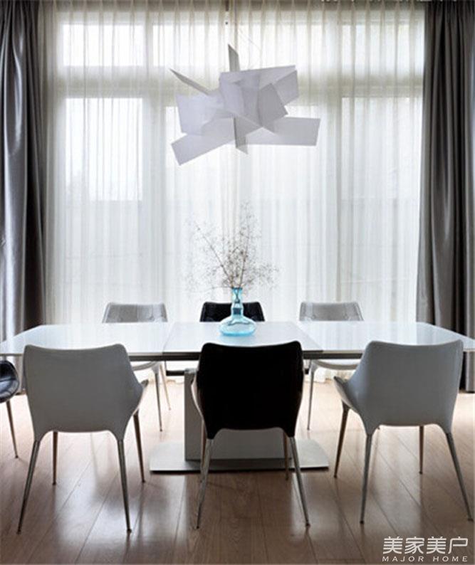 简约的时尚居室里面的餐厅依然简单,无论颜色还是线条,简约、直接依然是它的特点。黑白搭配的餐桌,垂吊下来同样用几何线条绕成的时尚吊灯,让用餐区更加简约时尚。
