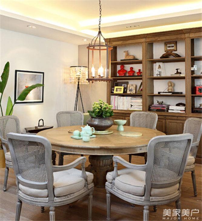 独立的用餐空间里面摆放厚实的大圆桌,是一家团聚的好寓意。木制的圆桌以及餐椅,大气而朴实,毫不夸张。带配上若干的绿色植物装饰,缔造一个极为朴实而沉稳的用餐空间。