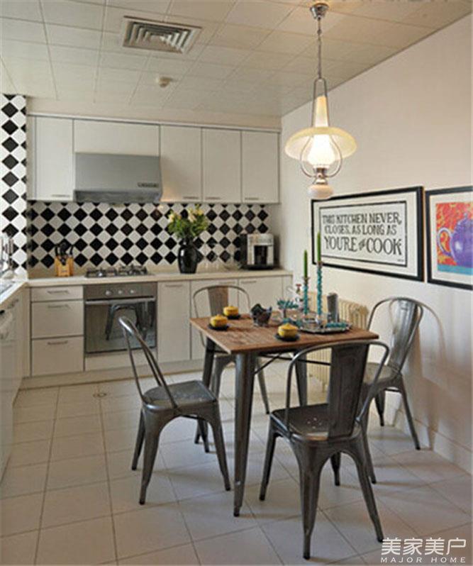 很多小户型空间除了把餐厅与起居室设置在一起之外,把餐桌摆放到厨房里面也未免不是另一种方法。搭配上天花板的老式吊灯,暗黄的灯光落在用餐空间里面,朴素、怀旧的氛围更让用餐变得浪漫、动人。