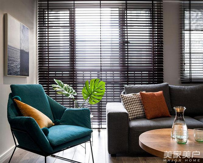 百叶帘将阳光舒适的洒在客厅沙发上正好沐浴阳光