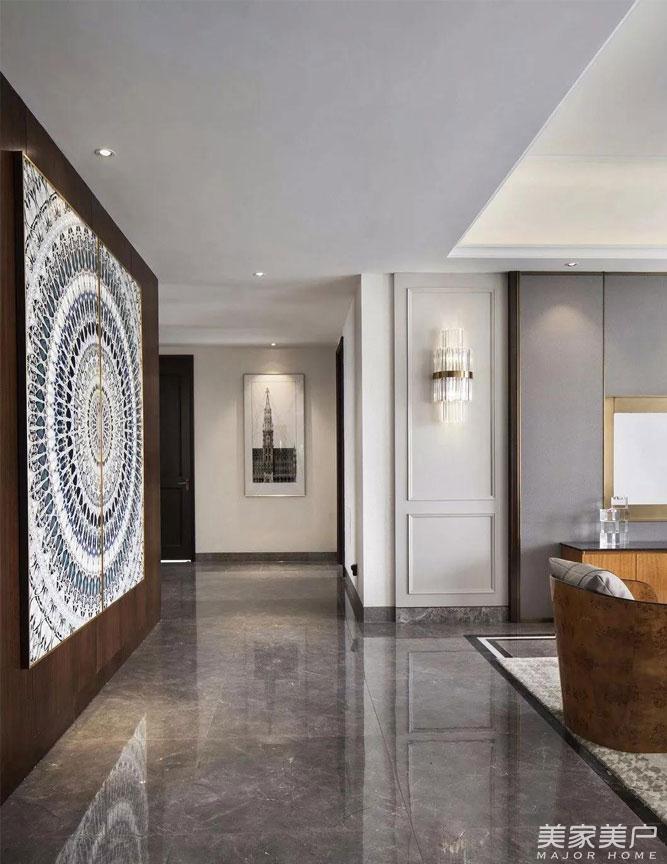 在整体明亮简约的浅色大空间中,过厅处一面棕色原木墙超脱出来,赋予了空间朗朗气度之美,设计师顺势而为,只以巨幅花纹装饰画装点其上,层层发散状的圆环花纹,神秘而富有张力,让空间更显气韵生动。