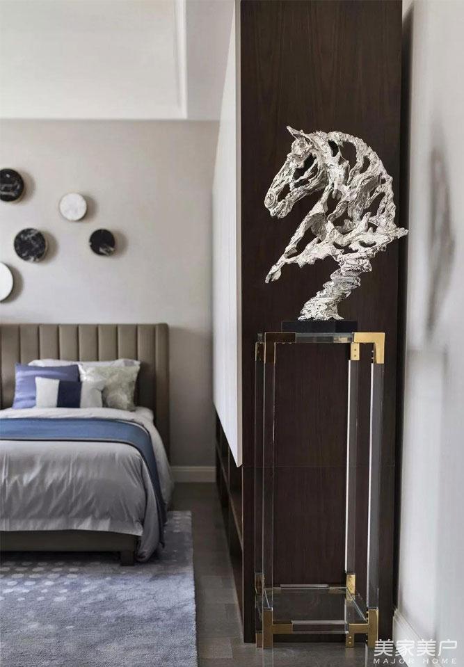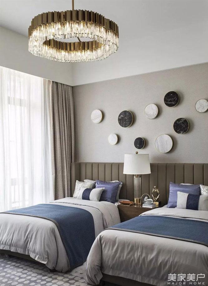 老人房为高级酒店式的双人床大开间,设计关照老人的深度交流与更优质的睡眠,整体环境清爽且稳重,圆形黑白大理石艺术装饰画与灰色地毯上的白色圆点花纹互相呼应,中性偏柔和的空间中,一抹深幽的蓝色具有平衡的作用,安静又宁谧。
