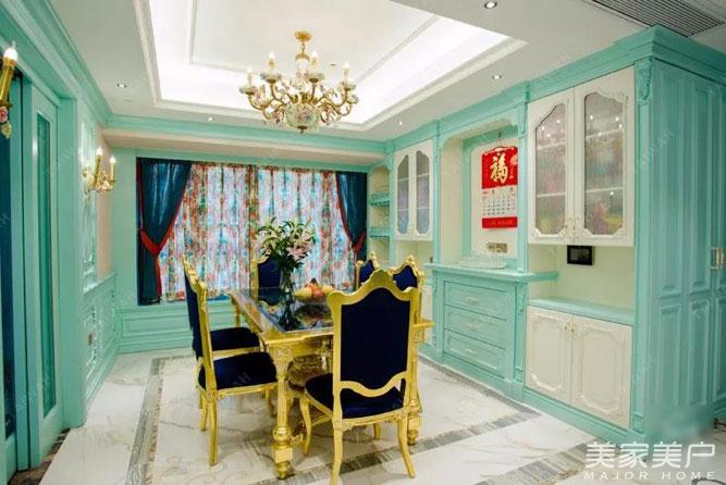 Tiffany蓝清新淡雅的色彩、柔和的光线、配搭暖白柜门的酒柜、华贵的线条、精致的餐具加上安宁的氛围等等共同构成了西式餐厅的特色。