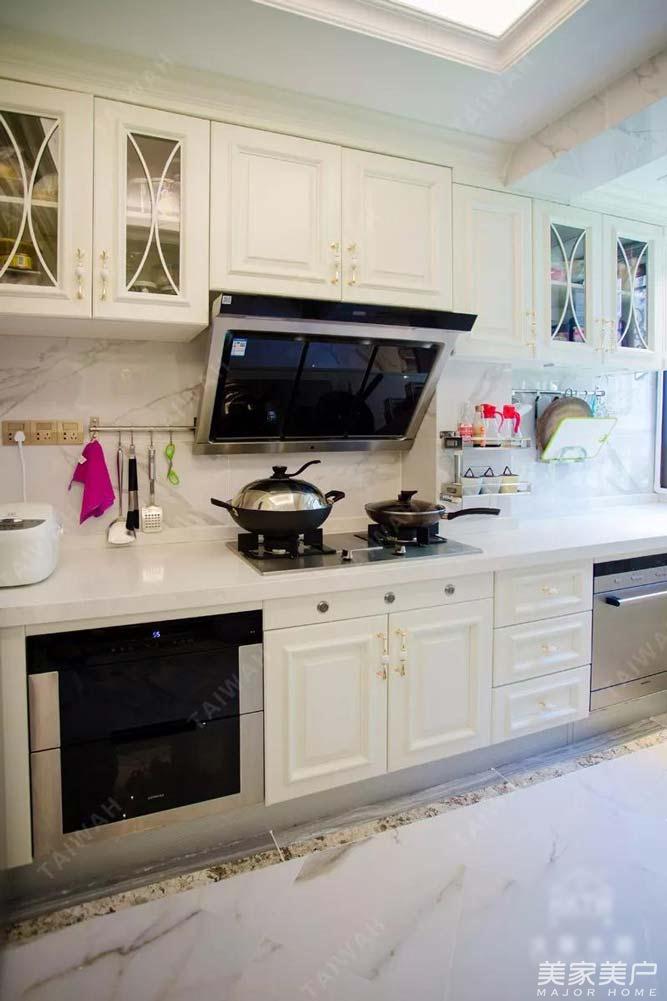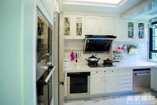 厨房面积不大,因此采用白色橱柜,纯净白色给人一种清爽、自在感,还能提亮整个空间。内嵌式小厨电设计,更是减少了占地面积。