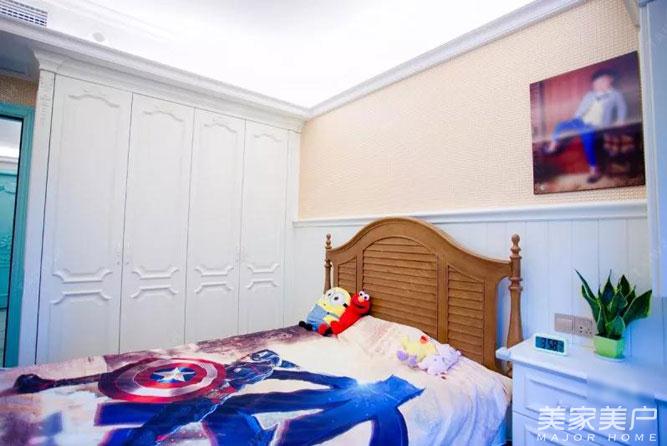 儿子房采用暖白为基调,营造舒适轻松的环境,考虑孩子正处于好动年纪,为充分保证孩子的安全,采用半护墙包裹,降低孩子攀爬的危险。书柜中间留空,上柜以玻璃封闭,通透明了。