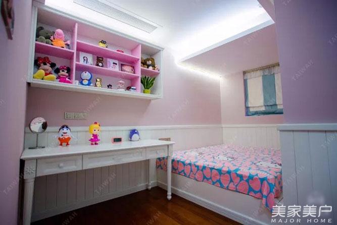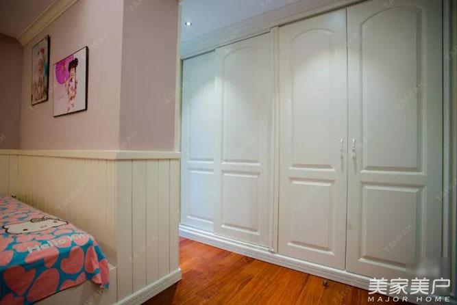 女儿房,略为狭窄的空间,设计与配色搭配变得尤为重要。榻榻米是小空间的救星,榻榻米铺就的睡床,床后的小空间利用成小小的衣帽间,衣柜做成一边趟门一边推拉门,让每一寸空间都得以合理利用。
