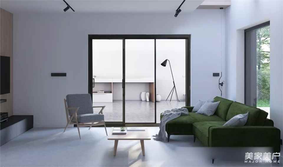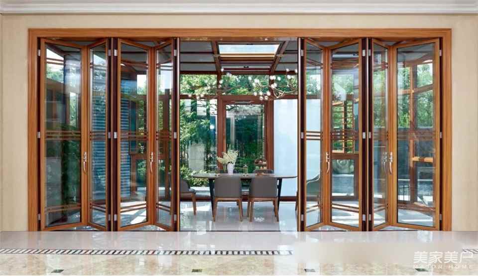 利用折叠门将阳光房和室内隔断开,能够增大空间感,和整体搭配融合在一起。玻璃的透明性在视觉上并没有隔断阳光房和室内的联系。