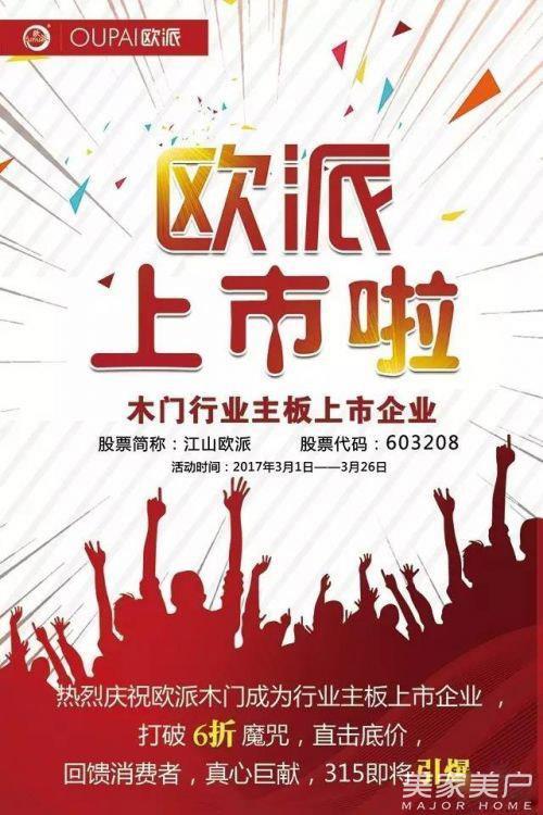 在这样的经济环境形势下,行业大浪淘沙的局面尤为激烈,科技创新、综合实力强、核心竞争力突出的企业必会脱颖而出,并得到健康、高速的发展! 2017年2月10日,新春伊始,万象更新,伴随着尚未消褪的凌冽寒风,迎来了上交所一声悦耳的钟声,欧派木门成功登陆上海证券交易所A股主板,成为行业内主板上市企业;奠定了欧派十年基业的稳固发展,开启了欧派未来的新征程……