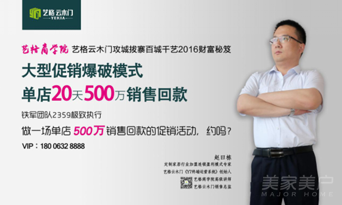 20年前,一个人,几块板,在家就可做出一樘门。20年来,量尺做门,千篇一律,束缚着消费者的选择。然而今天,艺格商学院和您见证“互联网思维”“个性化需求”碰撞一体的营销时刻,领略铁军团队2359极致执行20天500万销售回款!