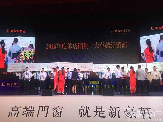 晚上,还举行了新豪轩2016新品发布会。新豪轩总经理黎国亮讲解了防爆门、不锈钢门、新品木门、V90铝门、铂金系列铝门、弧形窗、至尊地弹门等多款新产品的性能和体验,更加强了经销商与新豪轩共发展的信心。
