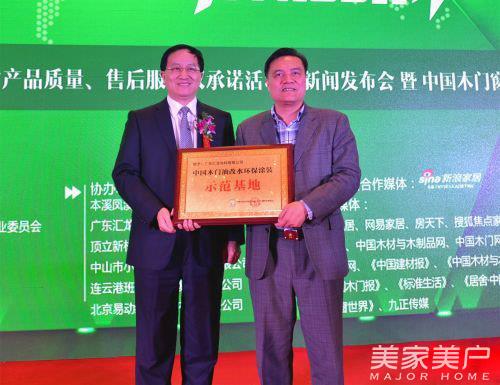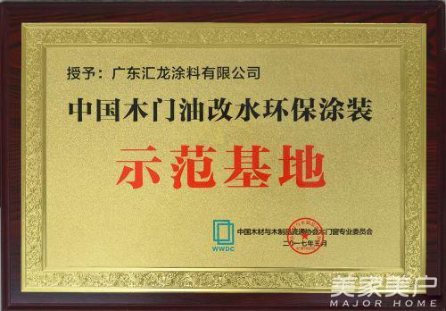 2017年3月13日,由中国木材与木制品流通协会、中国木材与木制品流通协会木门窗专业委员会、中国国际门业/ 定制家居展览会主办,广东汇龙涂料有限公司协办的行业盛会“2017年中国木门30强发布会”在京举行。凭借国内第一个木门“油改水”示范基地——汇龙六维涂装中心的杰出表现,正式获得行业权威授牌:中国木门“油改水”环保涂装示范基地。汇龙涂料董事长陈辉庭出席盛会并接受荣誉牌匾。