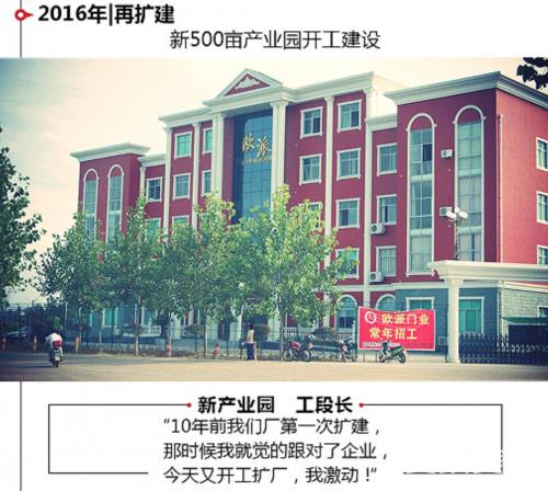 2016年,距离江山欧派第一次扩建已经过去了10年,在这一年,江山欧派再扩建,500亩高新产业园开工建设,代表行业领先水平的新设备、新工艺成为江山欧派制造实力的体现,“好木门,欧派造”将成为更多人心中的共识。