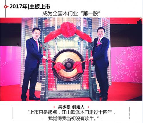 2017年,是江山欧派真正走向辉煌的起点。2月,江山欧派成为木门行业首家成功上市A股的企业,这一刻,对于每一个江山欧派人而言,意味着太多。万事开头难,敢为天下先,需要的不仅仅是实力和勇气,还需要独到的眼光和强大的执行力,当这些因素汇集在一起,木门企业的A股上市梦,成为了现实。