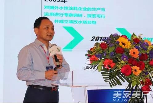白玉兰家具有限公司董事长沈忠民发表《油改水之路上的思考》,沈董介绍了油改水的历程,以时间轴的形式表达出来,同时,他表示,油改水如果处理不好,可能对水资源造成污染,他们的应对举措是加强污水处理,用科学的方法解决油改水过程中有可能造成的水污染。沈董用详细的数据展现了从12年-16年所取得的成果,质量在逐年上升,每年都有增加,水性化后的涂装车间效率变化非常大,能耗也在逐年下降,同时用图片的形式介绍了水性漆做的各种产品,同时得到了CARB-ATCM-SGS等在内的中国首家四项权威的认证,最后,沈董总结了7点油改水之路上的心得和感悟。必须具备强大的内心和坚定的信心才能在油改水的路上走的更远。