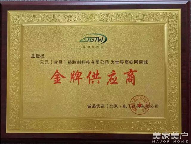 2017年5月22日,天元(宜昌)胶粘剂科技有限公司(以下简称天元胶粘剂)正式通过世界高铁网资格审核,成为其指定金牌供应商,可以享受金牌供应商平台提供的专项特权,天元胶粘剂将迅速成为优质采购商的合作伙伴。