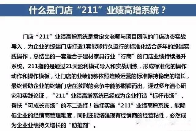 福临门世家二次创业的宗旨“让经销商持续盈利下去”,我们的团队一直在思考:如何给经销商一套能够自己操作的门店运营系统,不用通过促销活动,也不用增加额外的投入,通过提升团队的技能和提升门店的管理水平,就能达到提升门店的业绩的目的呢?通过研究家居建材业成功案例后,福临门世家决定,借用外部力量,携手知名咨询团队,共同打造专属于“福临门世家”的211门店业绩高增系统!