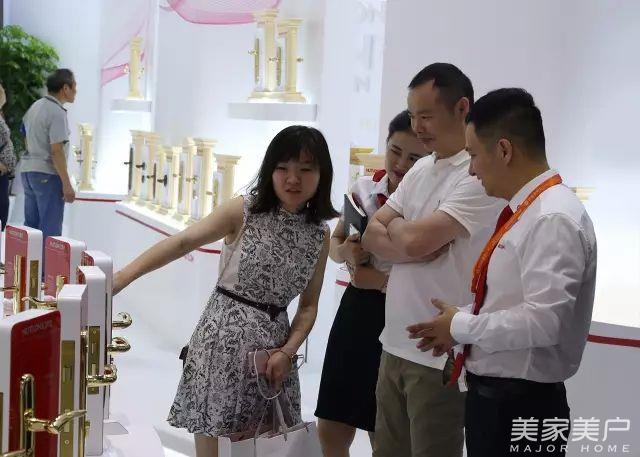汇泰龙工作人员为现场客商讲解艺薄系列门锁