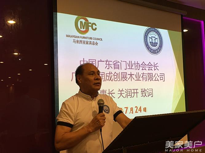 随后,广东省门业协会会长、广东润成创展木业董事长关润开发言。他说:“今天,中国、马来西亚新老朋友相聚在美丽漂亮的吉隆坡,共同见证两地家居行业的成长和发展,增进了解和友谊。2016年10月,马来西亚柔佛州峇株吧辖家具同业公会同仁来到广东,我们进行了探讨交流与合作,也结下了深厚的友谊,此次有幸能够来到马来西亚考察学习。广东省门业协会自成立5年以来,已经发展成为拥有会员企业400多家,并形成国内颇有影响力的行业组织。广东拥有定制家居、木门、铝合金门窗、钢质门、锁具五金、涂料配材、机械配件等逾3000家,产值估算千万亿元,广东省门业协会有效的整合了上、下游产业链资源优势,将打造国内最强大的门窗与家居产业链平台。马来西亚同仁勤劳善良、热情好客,这里有着丰富的木材等资源,也有着很好的家居消费市场,为我们有更多的合作奠定了坚实的基础,希望我们双方在技术、资源上有更多的合作交流,在适当的时候再次邀请马来西亚家具同业公会同仁莅临广东实地考察。”