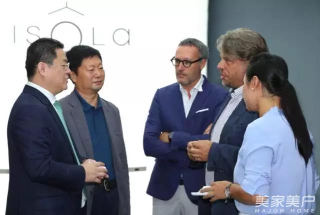 全国工商联家具装饰业商会执行会长张传喜(左一)、华鹤集团董事长吴雪松(左二)与专程前来参加本次新品发布活动的两位意大利知名设计师交流
