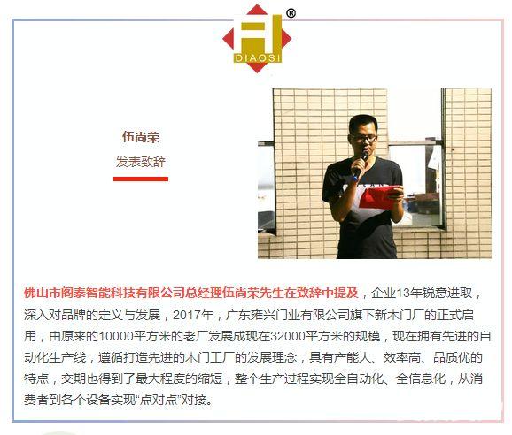 梁总在致辞中表示,雍兴门业13年锐意进取,深入对品牌的定义与发展,2017年,广东雍兴集团旗下“木门厂”佛山市阁泰智能科技有限公司的正式投产,新木门厂拥有先进的无尘车间,进一步引领企业产品的技术变革,使雍兴门业产品更多元化、高端化和环保化。下一步,产品研发追求创新突破、创新创意制造相结合;整合优质供应链,营销服务团队,提升全国市场核心竞争力!
