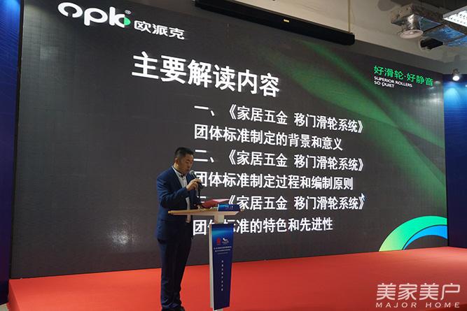《家居五金 移门滑轮系统》团体标准主起草单位中山市欧派克五金制品有限公司总经理许超在发言中谈到:标准的竞争将成为未来市场竞争的最高形式。我相信,代表高技术高水平的团体标准的制定、发布及实施,将提升中国中高端家居五金产品的品质,占领行业品质制高点,逐步获得与国际一流品牌同等竞争的资本,抢夺国际高端市场。欧派克希望和大家共同去践行这一团体标准,提升产品品质,树立品质标杆,赢得企业发展,引领并规范行业发展。