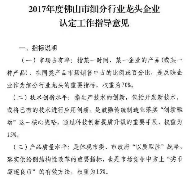 据了解,此次评选细分行业龙头企业的要求相当高,要求通过市场占有率,技术创新水平,产品质量水平三项按权重比例评选得出。
