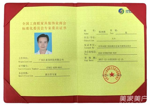 12月26日下午,在全国标准化委员会工作会议中,汇泰龙董事长陈鸿填先生被全国工商联家具装饰业商会任命为“标准化委员会副主任专家”!二十一年风雨兼程,陈鸿填先生带领汇泰龙从传统企业到如今的科技型企业,悉心耕耘、笃行致远。汇泰龙会继续积极探索,为全国家居行业标准化出一份力!