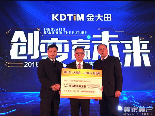 佛山市人民政府、三水区人民政府对金大田公司上市扶持奖励资金150万元