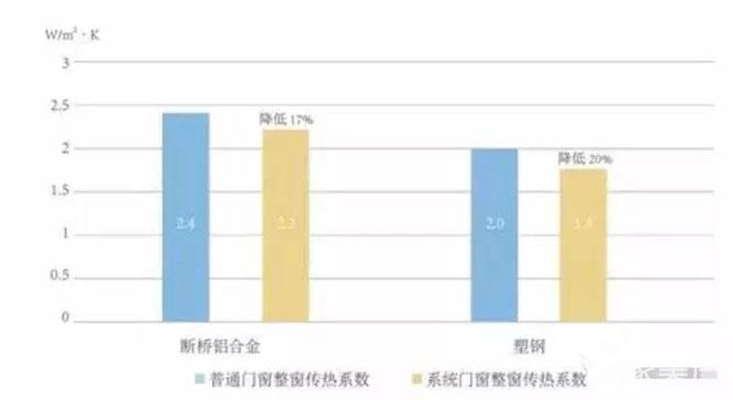 从节能的角度,针对最常用的断桥铝合金和塑钢材质,我们进行传统门窗和系统门窗的整窗传热系数对比,系统门窗整窗节能数据较有优势。