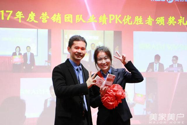 在销售团队表彰环节,副总裁但咸熙先生为大家回顾了2017年初销售团队满腔热血、斗志激昂,铿锵有力地给公司立下军令状的难忘一幕。这一年里,他们披荆斩棘、奋勇拼搏、兢兢业业、克服各种艰难险阻,最后有优秀代表不辱使命,胜利完成所立的誓言!她就是五洲店店长,出色并超额地完成了军令状!祝贺她!
