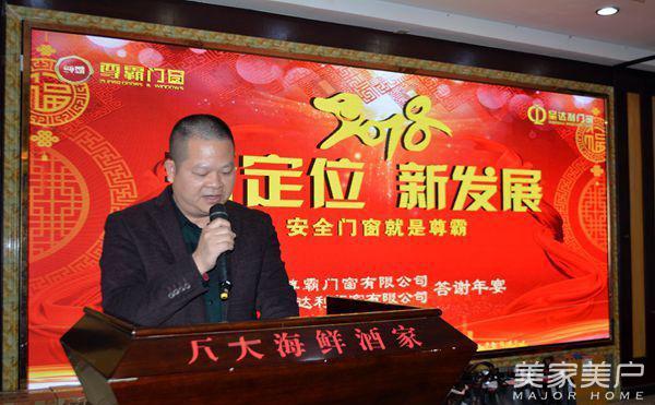 尊霸门窗刘董事长上台致辞,回顾了在2017年中所取得的成绩,并表示尊霸门窗能够取得如今的成就离不开供应商们的支持以及全体员工家人们的付出,因此在此向大家致以深深的谢意。最后,刘总还展望了尊霸门窗在2018年的总体规划,并希望尊霸家人们能再接再厉,争取在新的一年,再创佳绩。