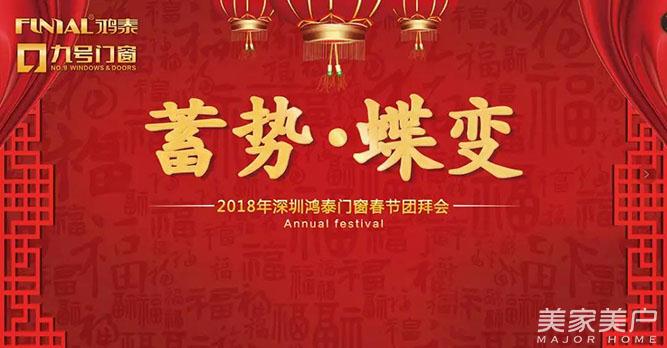 2018年1月29日,以《蓄势·蝶变》为主题的2018年深圳九号门窗春节团拜晚会在深圳龙泉大酒店拉开帷幕;九号门窗全体同仁及嘉宾,大家欢聚一堂,共同庆祝昨日的辉煌业绩,共同展望幸福美好的明天!