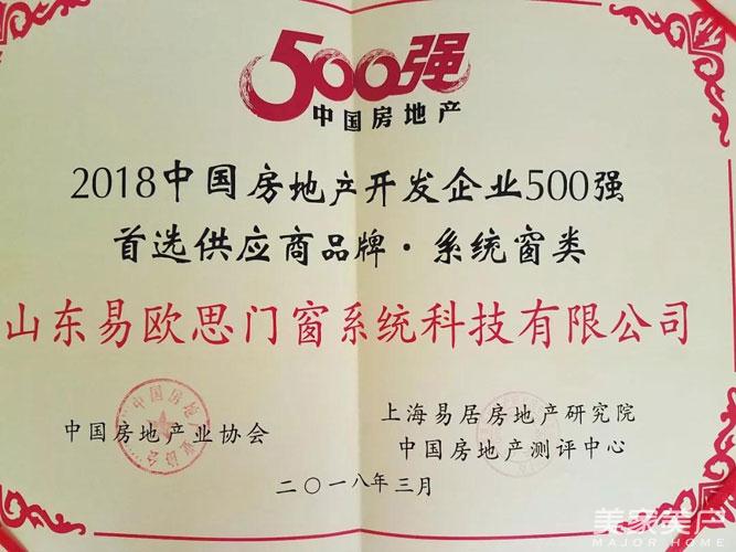 山东易欧思门窗系统科技有限公司荣获“2018中国房地产开发企业500强首选供应商品牌·系统窗类”;