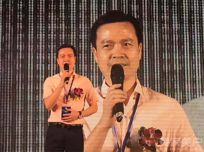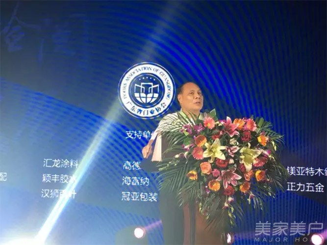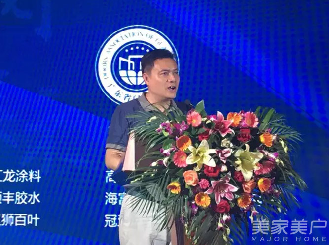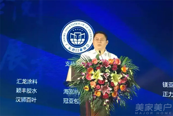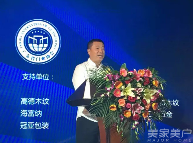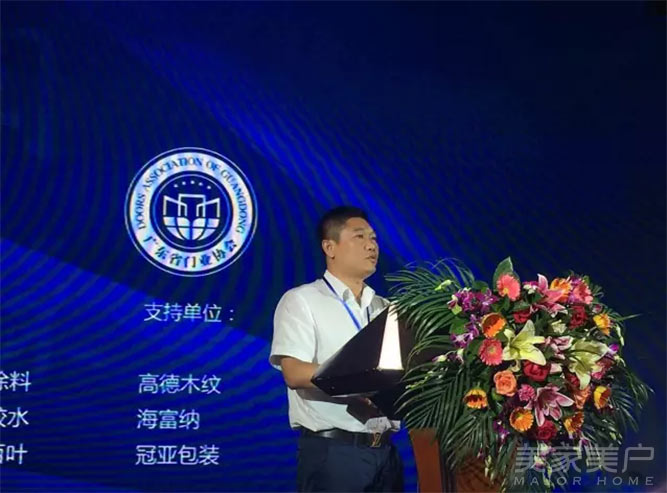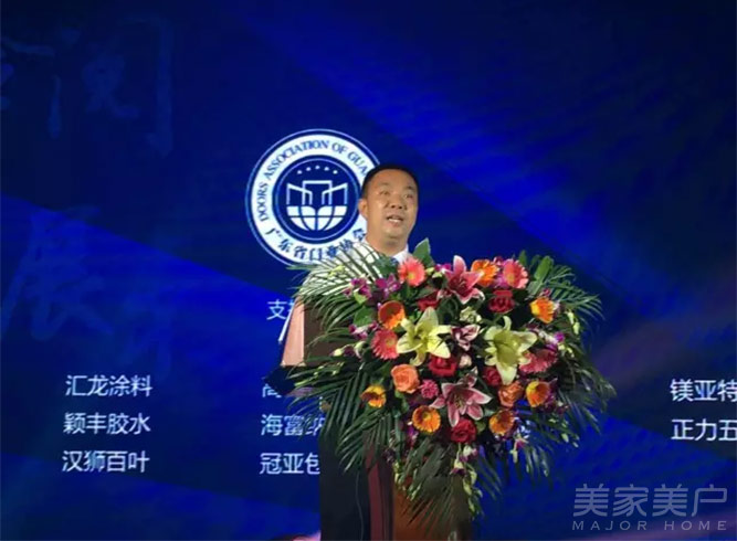 广东省门业协会常务副会长、广东汇龙涂料有限公司董事长陈辉庭在会上致辞。他说:“今天迎来今年最火爆的广东省门业协会换届选举大会和中国门业豪门盛宴。我相信,只有门企不断接受检验,不断升级,才能有大的发展。”