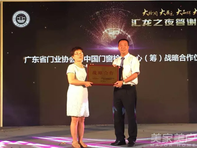 在汇龙之夜豪门盛典晚宴上,一场劲爆的开场舞《大盛世》拉开晚宴帷幕,一首《大创造》,唱出门窗人的坚持和奋斗,所有与会领导上台共同举杯祝酒。同时,本次活动赞助商一一上台致辞,互道祝福。随后,中国门窗检测中心主任张兆芝上台发表讲话,为大家介绍中国首个门窗检测中心的筹备情况。同时,她还为广东省门业协会授予战略合作牌匾。