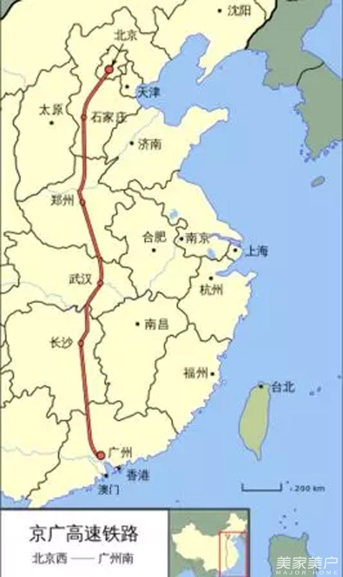 京广高速铁路自北京西站起,经过北京、河北、河南、湖北、湖南、广东6省市,止于广州南站,全长2298公里,共36座车站,设计最高时速350公里,运营时速为300公里(列车最高峰值时速不超过310公里)。沿途设有北京西站(经京广客运专线京西联络线)、北京丰台站、石家庄站、郑州东站、武汉站、长沙南站、广州南站等站点。