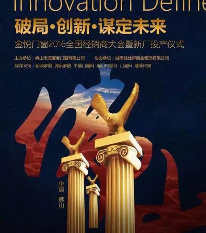 2016年7月5日 - 6日,金悦门窗举办了2016年全国经销商峰会。本次峰会以“破局. 创新. 谋定未来”为核心主题,传达了金悦门窗对内部改革的决心,以及对终端营销主动出击,赢战市场的必胜信念!