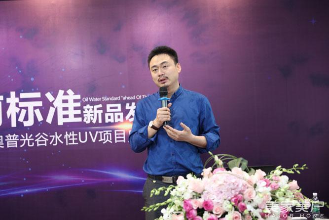 随后,奥普光谷水性UV总经理黄总说道:“该产品是我们公司技术团队历经一年多时间的研发,才有今天的奥普光谷水性uv漆。该产品配方的编号1366,意味着技术团队做了1366个配方。感谢每一位朋友的支持关心。中兴事件说明一个企业要有创新,从事行业23年载,亲身经历涂料行业历史,产品的同质化,水性涂料的研发从政府到行业到企业都是重点关注的对象,十分荣幸能经营这个环保事业。相信,通过我们的努力水性uv漆必将成为油改水领头军,真正颠覆涂料行业,成为涂料行业的核心。”