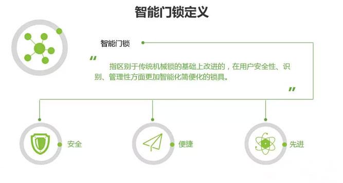 智能门锁是指:指区别于传统机械锁的基础上改进的,在用户安全性、识别、管理性方面更加智能化简便化的锁具。