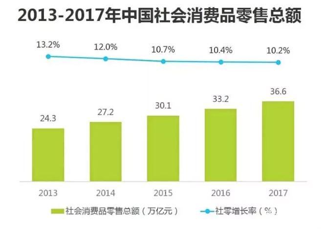 2017年社会消费品零售总额超36万亿元,增长率为10.2%,中国消费市场在平稳中较快发展。