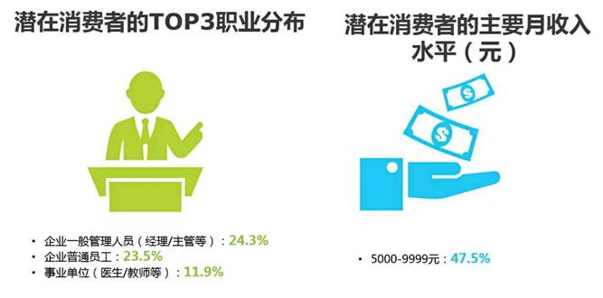 潜在消费者以男性(占53.5%)、本科学历(占68.8%)为主,较为年轻(过半在35岁以下),来自北上广等核心一线城市。并且,合计有59.7%的潜在消费者在企事业单位工作,并且有47.5%的潜在消费者月收入在5000-9999之间,拥有一定消费力。