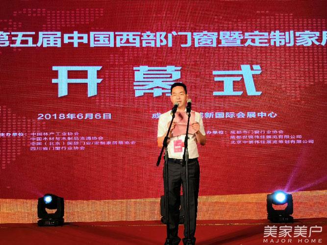 中国木材与木制品流通协会刘能文会长致辞,刘会长表示现在行业发展形势迅猛,西部门窗暨定制家居展会商机多多,日后协会将与各协会、企业一起努力,共同为行业与展会的发展多出一份力!