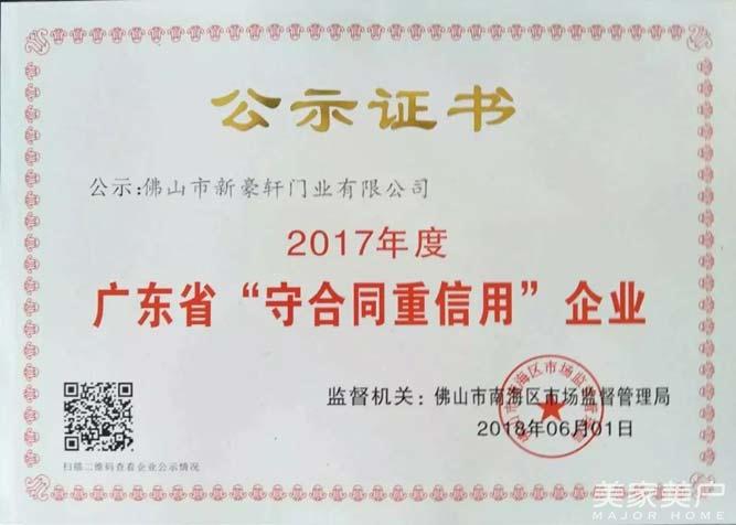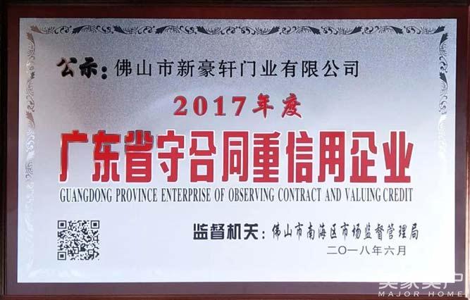 近日,经广东省工商行政管理局核准,佛山市新豪轩门业有限公司在众多企业中脱颖而出,授予“广东省守合同重信用企业”荣誉称号!