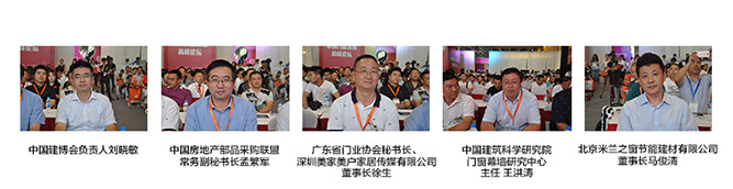 中国建博会负责人刘晓敏,中国建筑金属结构协会秘书长助理兼联络部主任、中国建筑门窗系统联盟执行理事长、全联房地产商会副监事长兼写字楼分会理事长、中国产业链创新合作分会监事长、中国房地产部品采购联盟常务副秘书长孟繁军,广东省门业协会秘书长、深圳美家美户家居传媒有限公司董事长徐生,全国建筑幕墙门窗标准化技术委员会秘书长、中国建筑科学研究院门窗幕墙研究中心主任、中国建筑门窗系统、联盟副理事长兼总工全国建筑幕墙门窗标准化技术委员会秘书长王洪涛,中国建筑金属结构协会副会长、中国建筑门窗系统联盟轮值理事长、全联房地产商会会长助理、北京中关村中欧节能门窗产业技术创新战略联盟理事长、北京米兰之窗节能建材有限公司董事长马俊清。