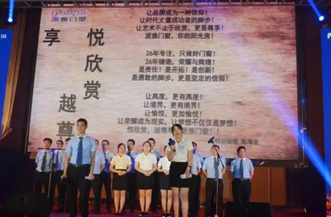 2016年派雅门窗正式启用了全新广告语“悦欣赏,越尊享”,展现了派雅的新起点,新高度,新未来。现场,派雅门窗团队精神抖擞,用精辟的诗歌,将派雅门窗最新广告语的涵义分享给在座的每一位经销商家人。伴随着激昂的诗歌,派雅门窗的新未来在这个夏夜开启。