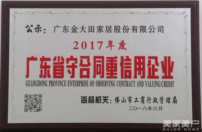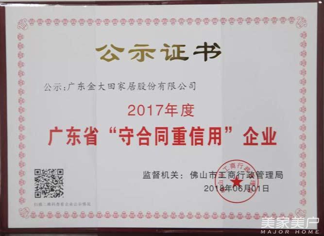 经佛山工商行政管理局审核认定,广东金大田家居股份有限公司荣获“2017年度广东省守合同重信用企业”称号,并在2018年6月进行公示。