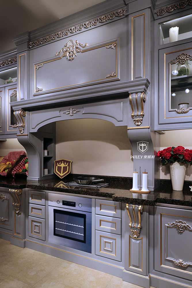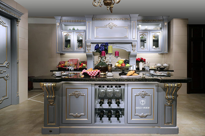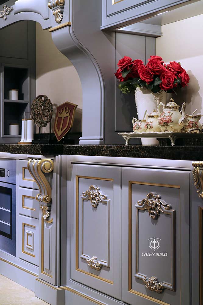 法式巴洛克橱柜以明亮婉柔的色彩,融于家具当中的韵律美,注重体现起伏的层次感,玲珑起伏,“S”形的涡卷纹柱托等元素为设计的主要理念。在纯手工雕琢的贝壳纹雕花,橡树果花叶等要素的修饰下,赋予了橱柜一种亲切和典雅的格调;柔光灯的影射下,整体融于一个浪漫惬意的气氛,法式情怀得到淋漓尽致的展现;东威利精致法式实木橱柜极具贵族气质与人文气息,就像法国人一贯的生活品位,厨房更成了家人缔造情感空间的最佳场所。