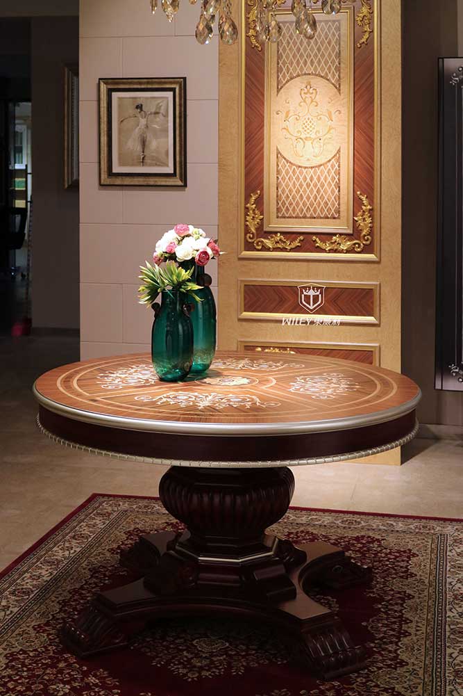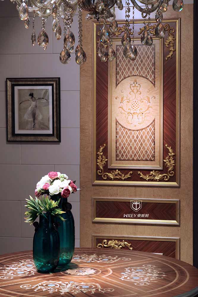 跟法式橱柜一起展出的还有东威利的高端贴皮餐桌和护墙板,以及升级版梯枝。