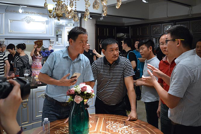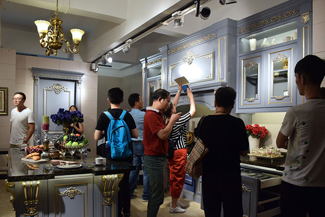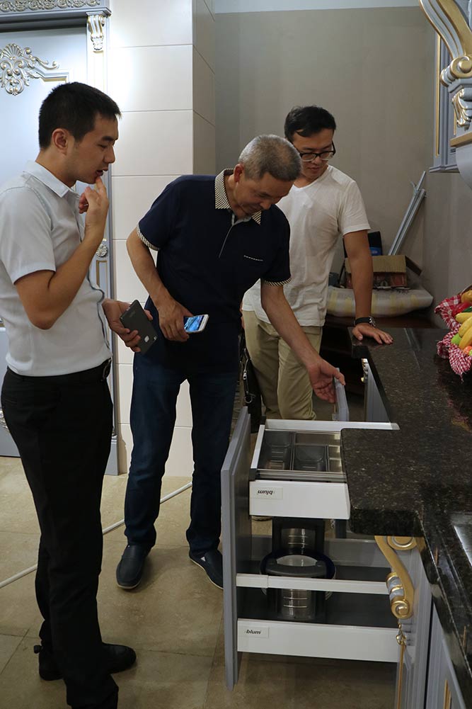 叶总语言生动地把法式橱柜的每一个功能细节讲解完毕,嘉宾们移步展厅现场体验法式橱柜新品。