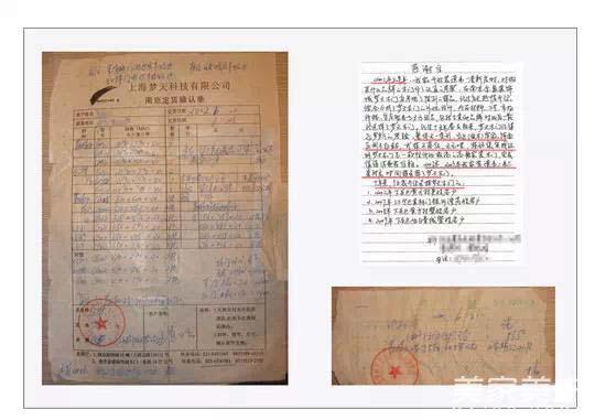 ↑江苏南京星雨华府于2002年购买的梦天木门以及收据、感谢信
